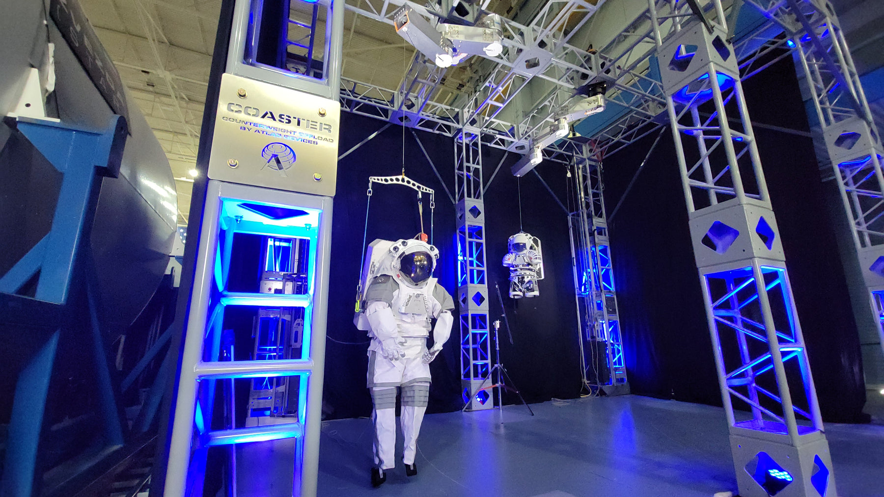 Designed for specific compatibility with Atlas's EXploration CONop (EXCON) mockup space suits, COASTER + EXCON together bring a powerful enhanced partial gravity suited environment capability for human spaceflight organizations looking to quickly and confidently answer big questions that drive vehicle and CONOP design in phases of the design process that are not yet mature enough to warrant testing in higher fidelity facilities, but that would benefit significantly from more flight like HITL testing than shirt sleeves can provide. Additionally, with a max load capacity of 750 lbs, COASTER can work with subjects wearing modern planetary walking suits.